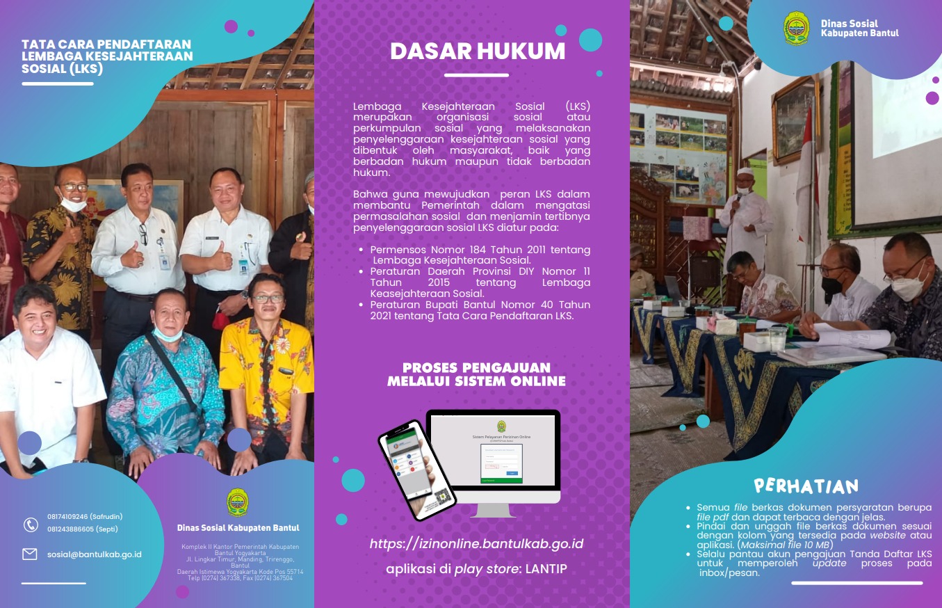 Bantul –Kabupaten Bantul kini menerapkan sistem pengajuan Tanda Daftar Lembaga Kesejahteraan Sosial (LKS) secara online. Kebijakan ini diambil guna mempermudah proses administrasi dan memastikan tertibnya penyelenggaraan kesejahteraan sosial di masyarakat.
